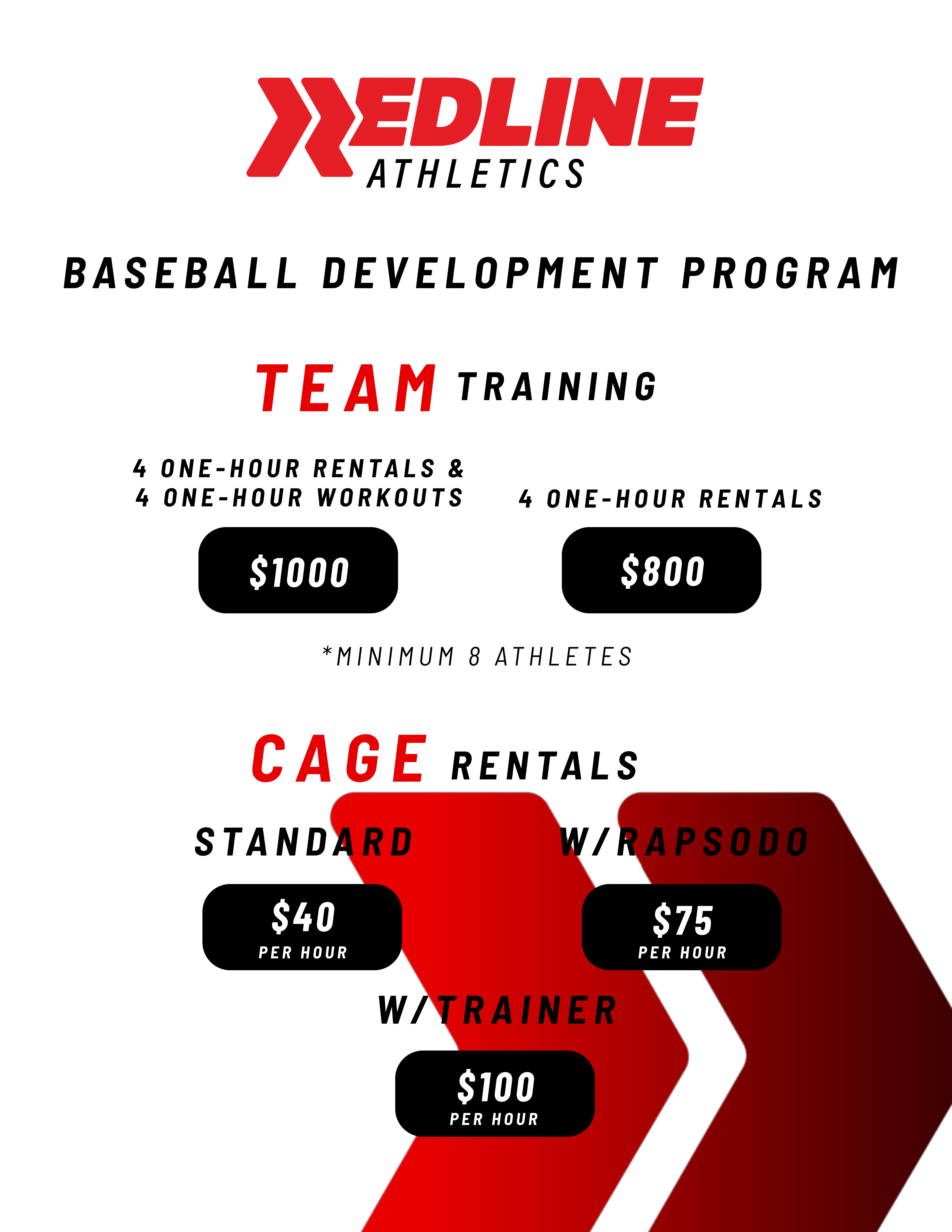Redline Athletics North Phoenix is a state-of-the-art facility with two batting cages available for rentals. Your choice of just standard cage rentals, rentals with Rapsodo, and cages with a Redline trainer!